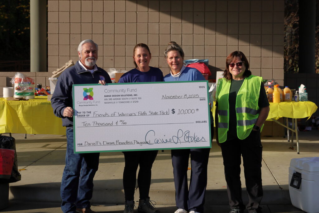 On Saturday, November 8, Jennifer Salyer of Barge Design Solutions Inc. presented Friends of Warriors’ Path State Park a $10,000 grant check. This award from Barge Community Fund is to be used for Darrell’s Dream Boundless Playground. Mary Steadman, Boundless Playground Chair, applied for a $5,000 grant with Barge, and Barge liked the project so much they decided to double the grant!