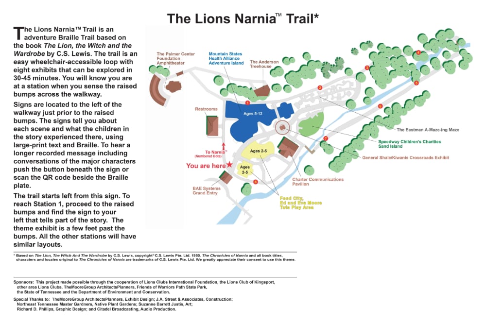 Thanks to the Lions Club organization, this trail removes barriers for the blind, visually impaired and handicapped. Based on The Lion, the Witch, and the Wardrobe fantasy by C.W. Lewis, the trail features eight sensory stations along a quarter-mile, wheelchair-accessible Braille trail. Here, visitors follow the story of Aslan the lion. Each station has an exhibit, a large print sign with Braille and a speaker button that activates an audio theatrical recording.